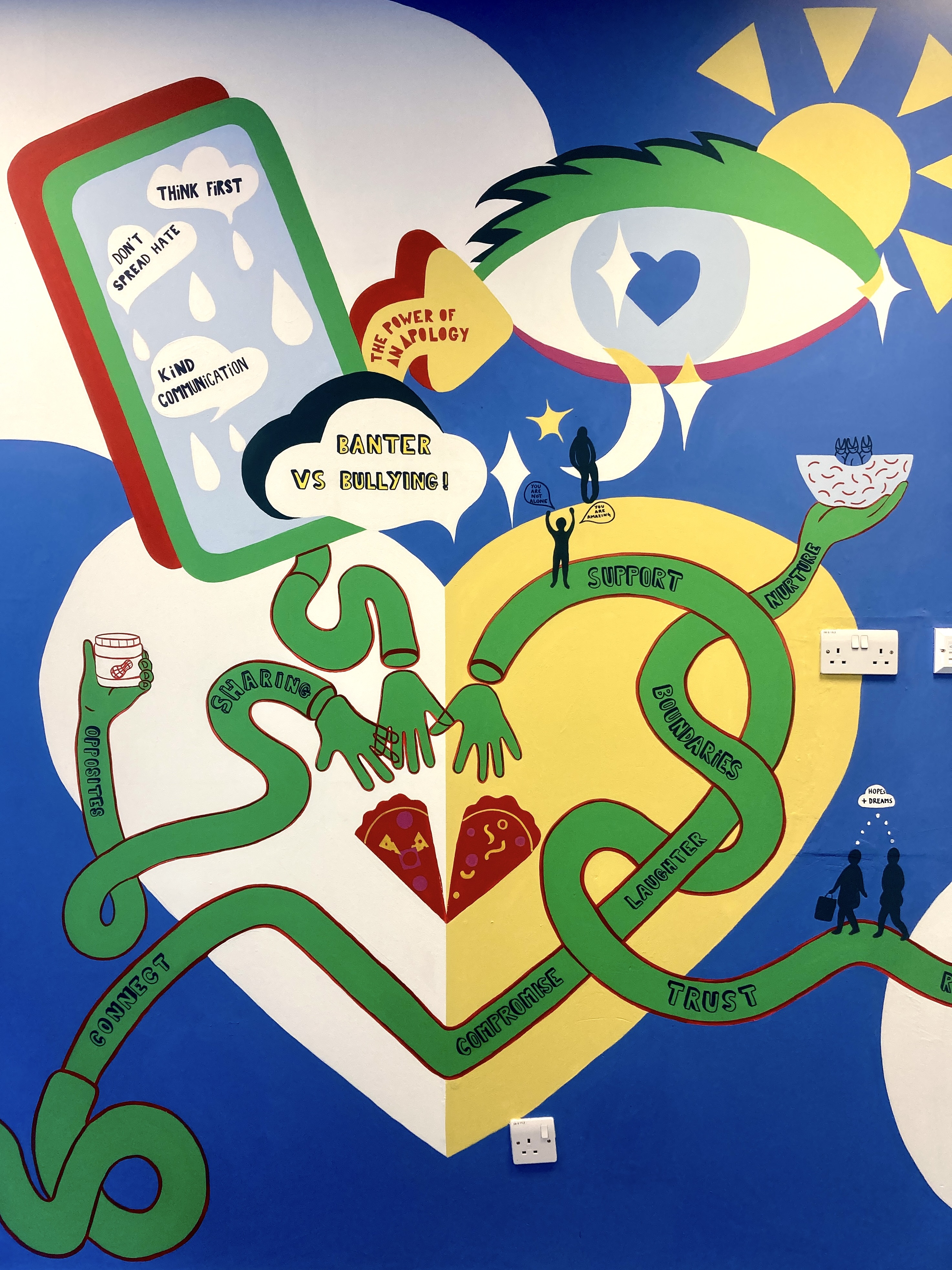 This project was a co-creative mural with 2nd year students for the school’s social and eating area, based on the theme of friendship. The aim of the project was to foster healthy connections between the pupils by supporting them to reflect on the meaning of friendship, collaborate on a fun project and feel united in their pride seeing their creativity and effort displayed in the school.